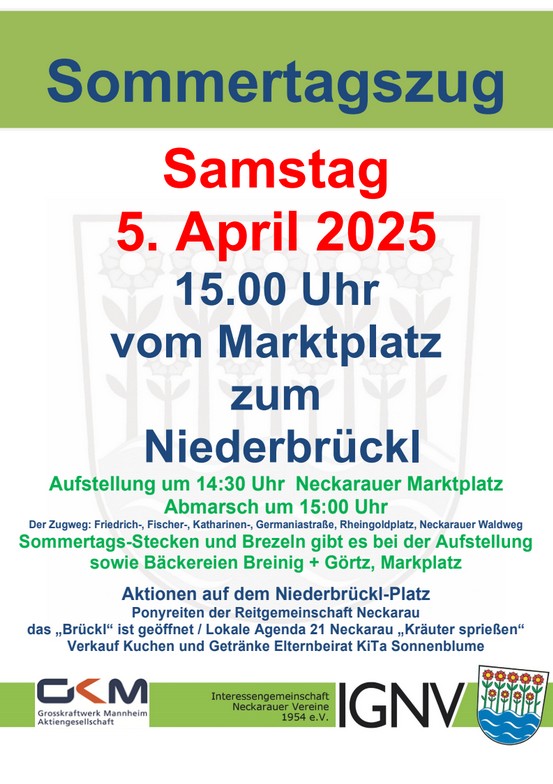 Die IG Neckarauer Vereine lädt herzlich zum Sommertagszug am Samstag, den 5. April 2025, ein. Der fröhliche Umzug beginnt um 15:00 Uhr auf dem Neckarauer Marktplatz, wo bereits ab 14:30 Uhr die Aufstellung erfolgt.